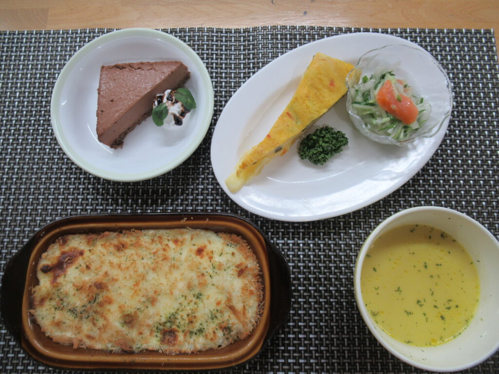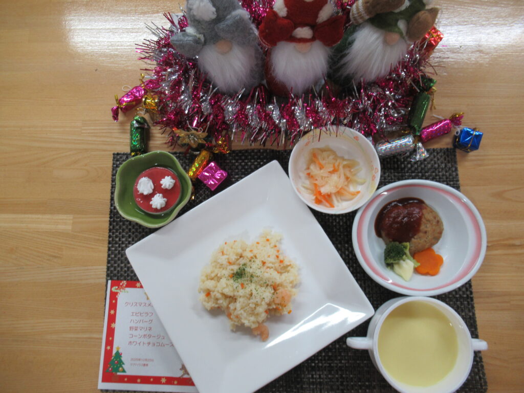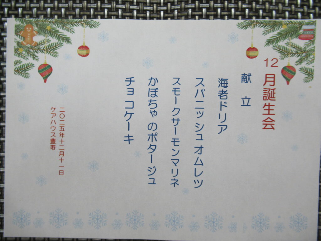 ・12月の誕生会のメニューです。海老ドリアにチョコケーキ、どれも美味しそうですね。