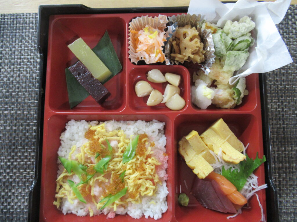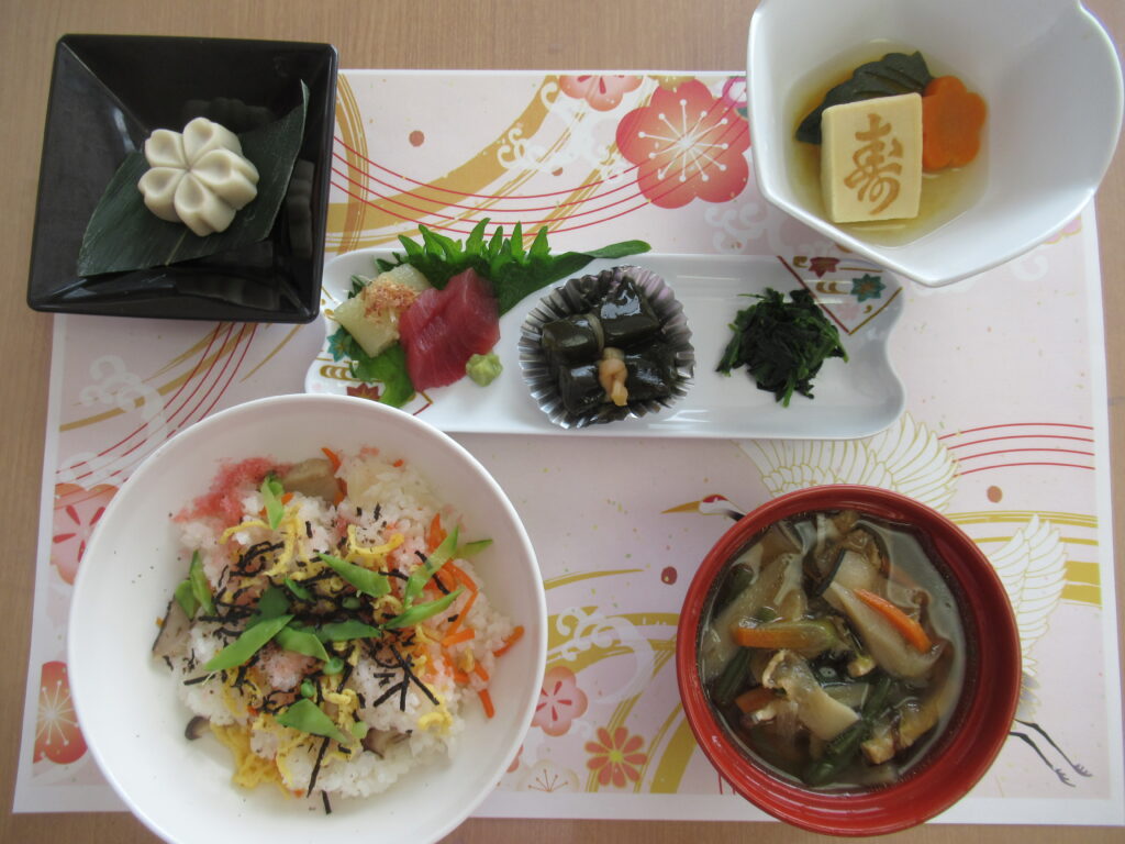 ・ 元旦のご馳走です。ちらし寿司に煮物に昆布巻き、くじら汁懐かしいですね。