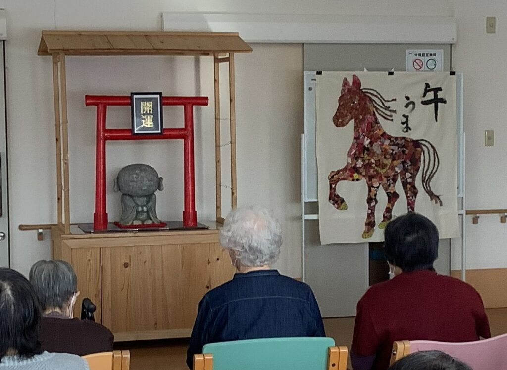 入居者様が作ったパッチワークの馬、見事な仕上がりです。