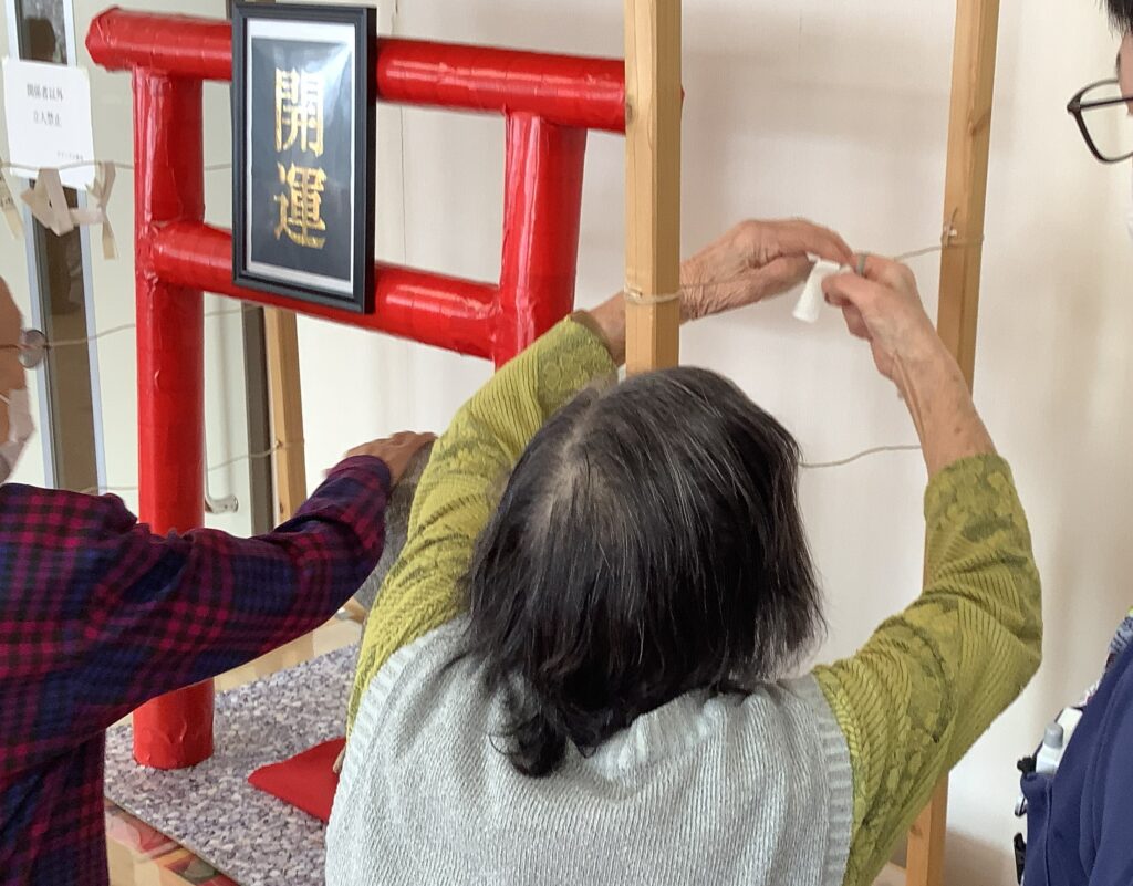 ・元気に過ごせますようにとおじそうさまを撫でて、おみくじを紐に結びます。