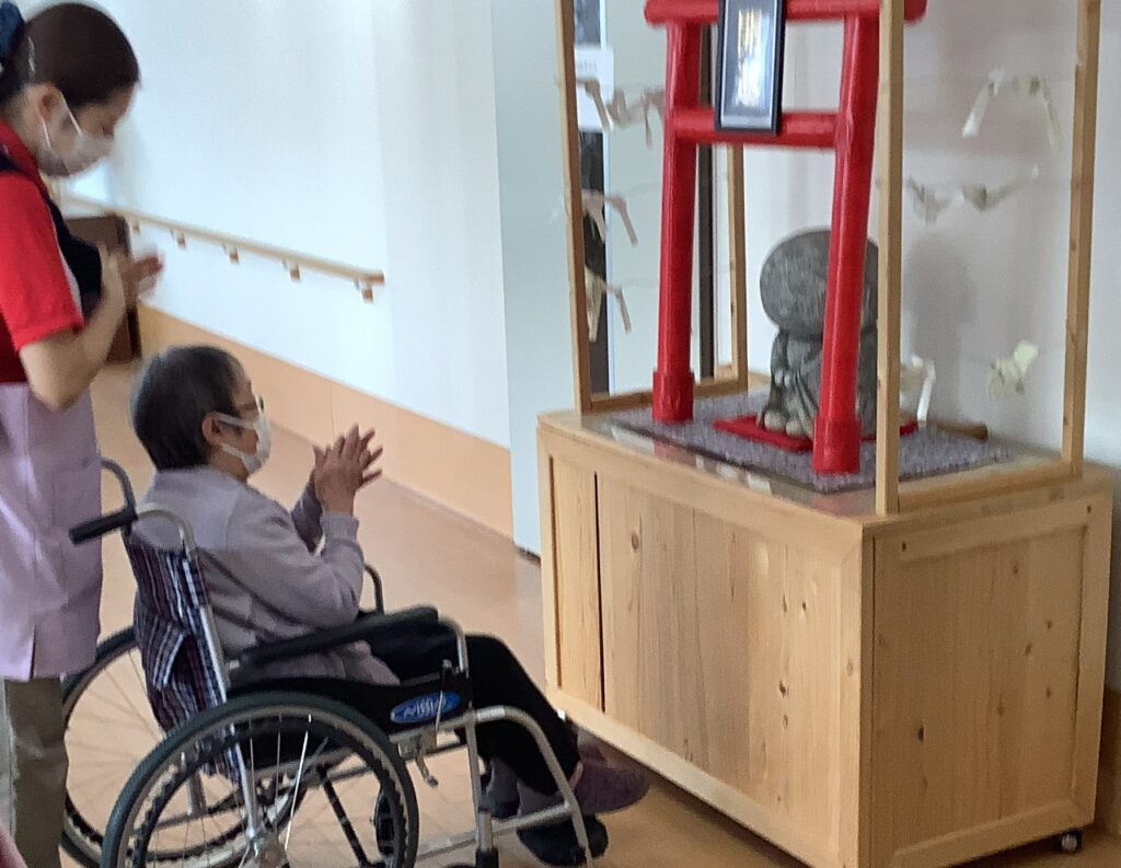 ・会場にはお地蔵さんと鳥居を設置し、パッチワークの馬を飾りました。