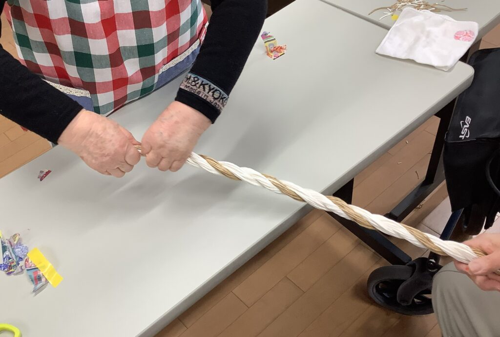 ・しめ飾りを手作りしました。本格的に縄から作り、とても良く仕上がりました。