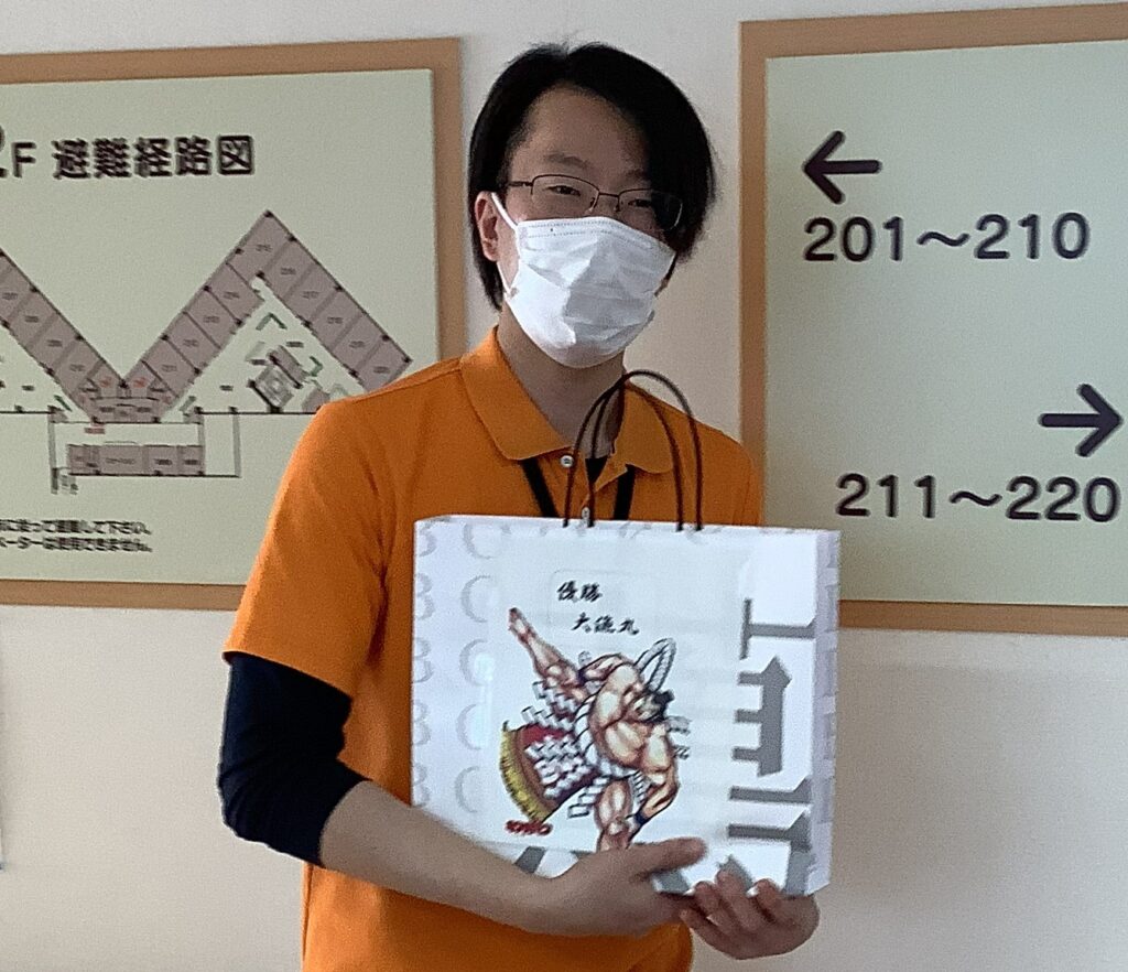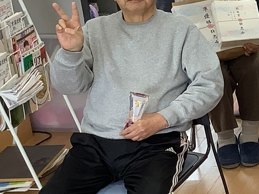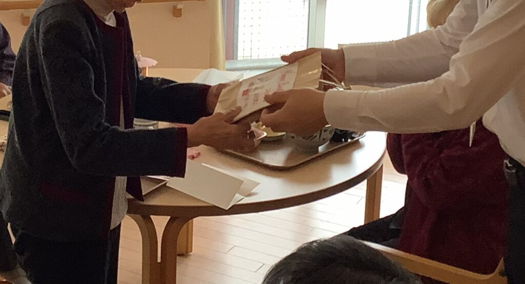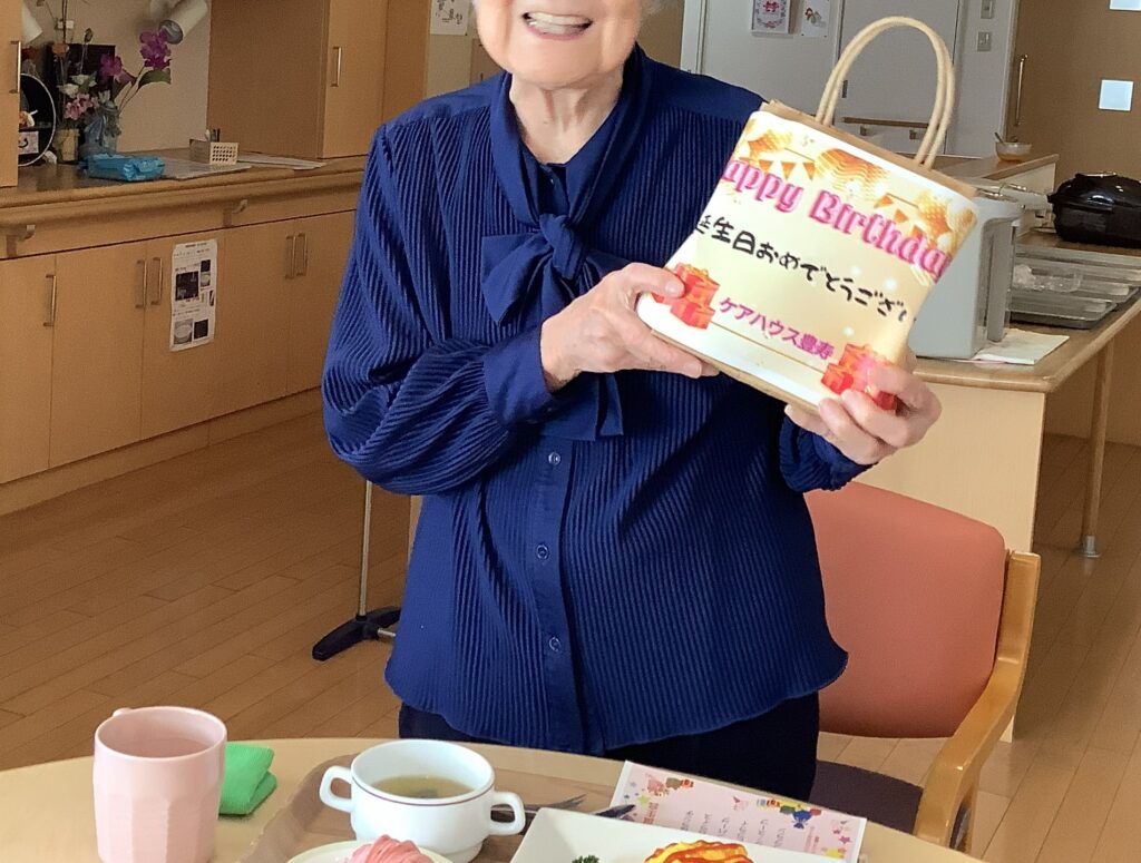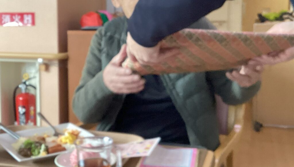 施設長から誕生日プレゼントを贈られ、喜ばれていました。
