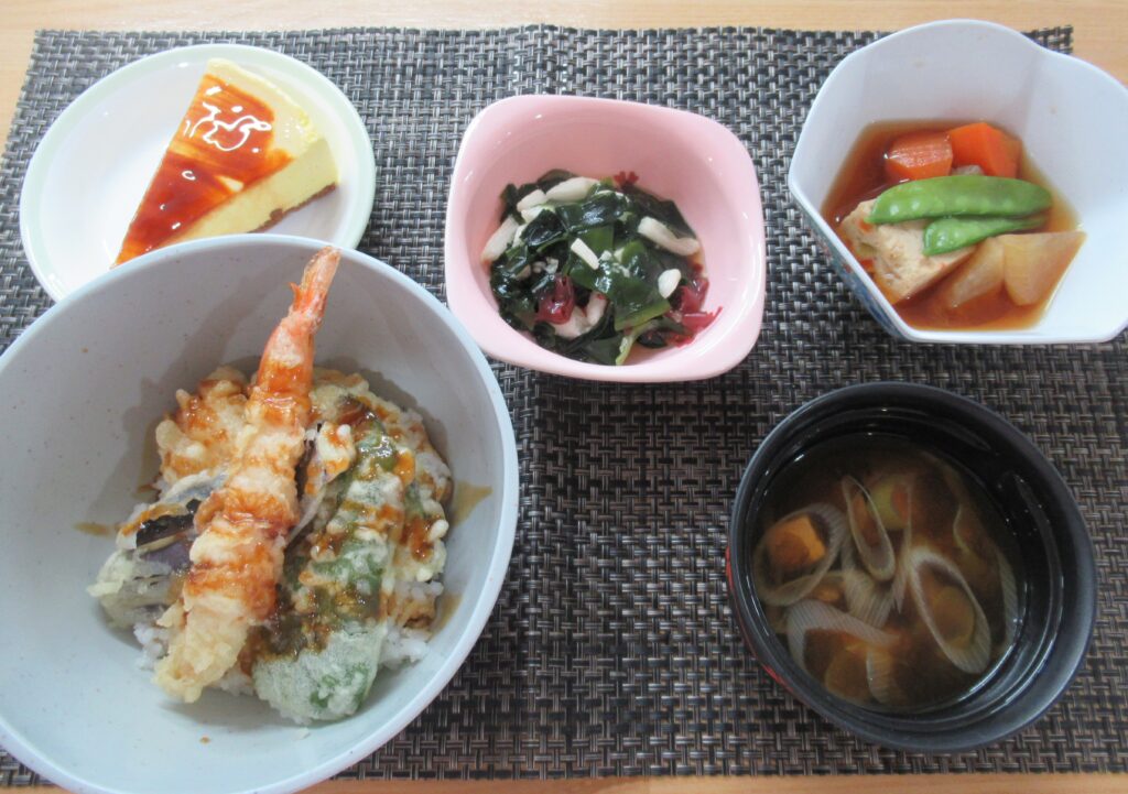 メニューです。天丼の海老天大きくてぷりぷりです。