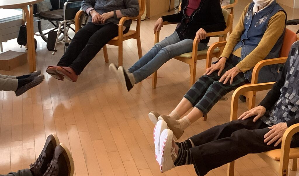 はい皆さん体操します。頑張って足をピーンと伸ばしてください。
